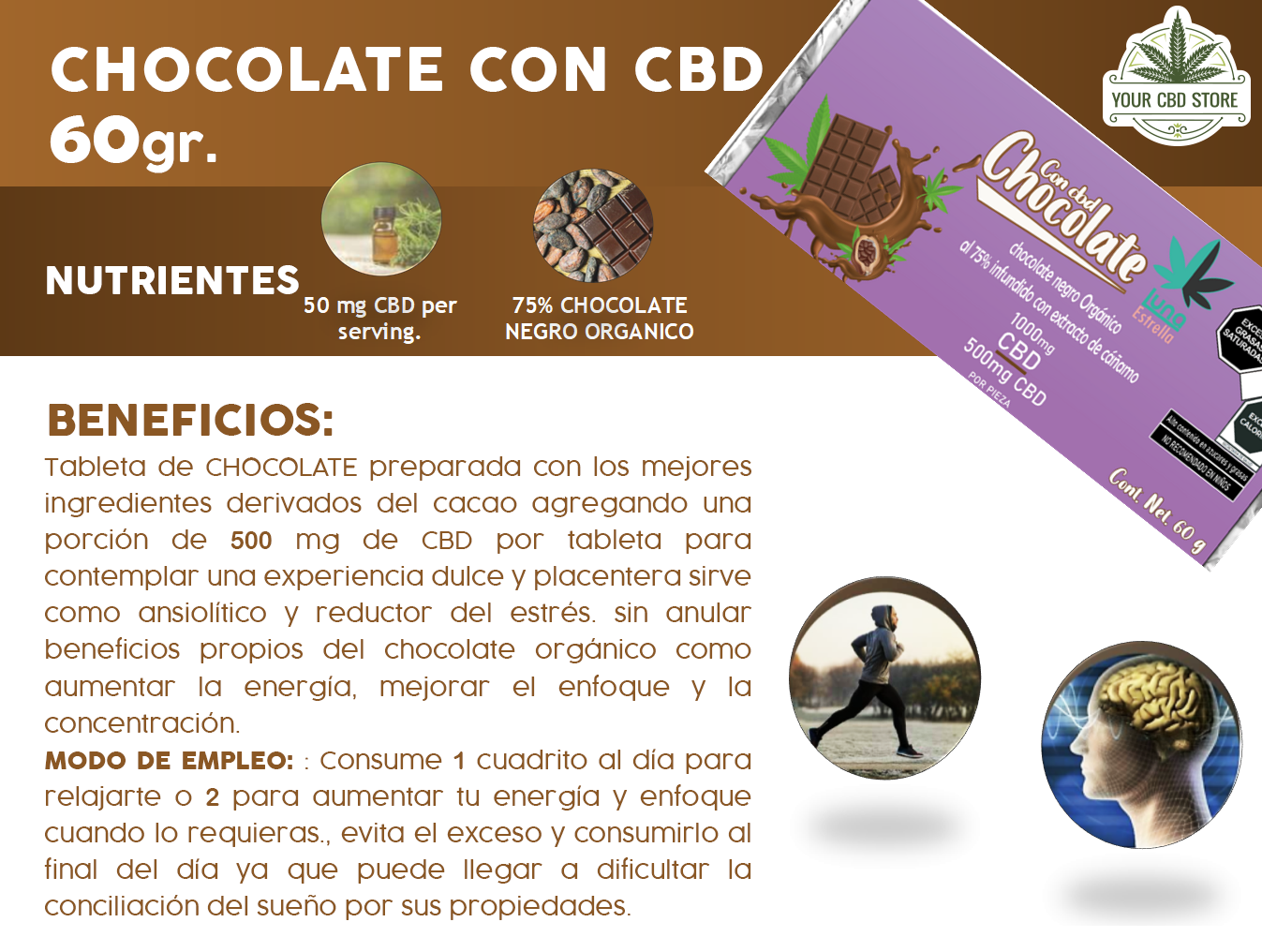 Tableta de CHOCOLATE preparada con los mejores ingredientes derivados del cacao agregando una porción de 500 mg de CBD por tableta para contemplar una experiencia dulce y placentera sirve como ansiolítico y reductor del estrés. sin anular beneficios propios del chocolate orgánico como aumentar la energía, mejorar el enfoque y la concentración.